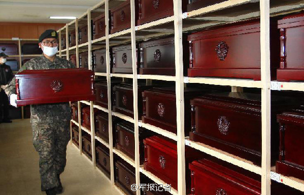 ???????昨日,在位于韓國京畿道坡州市的中國人民志愿軍遺骸臨時安置所,韓國方面將裝著遺骸的棺槨起運裝車。當日,韓方將存放在坡州市的437具中國人民志愿軍烈士遺骸的棺木起運至仁川國際機場。