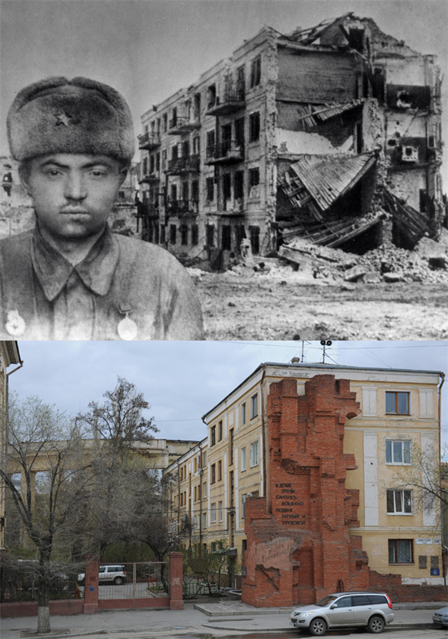 這張拼版照片上圖為在斯大林格勒拍攝的士兵巴甫洛夫與巴甫洛夫大樓的合成資料照片。巴甫洛夫曾帶領(lǐng)20多人在大樓與數(shù)倍于己的德軍浴血奮戰(zhàn),最終獲得了勝利。大樓因此被命名為巴甫洛夫大樓。下圖是2015年4月23日拍攝的巴甫洛夫大樓。如今這里已經(jīng)成為了一處民宅,但仍保留一處斷墻作為遺址并留有紀念的銘文(新華社記者戴天放攝)。
