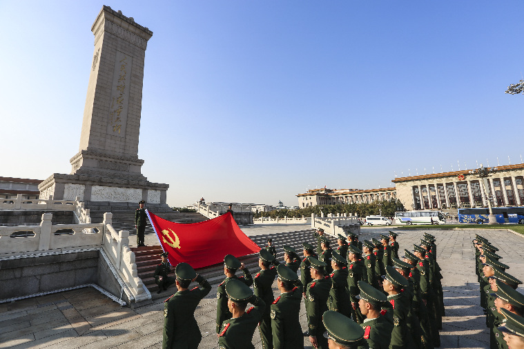 武警北京總隊(duì)掀起學(xué)習(xí)貫徹十九大精神熱潮,圖為官兵在人民英雄紀(jì)念碑下重溫入黨誓詞。安曉惠攝