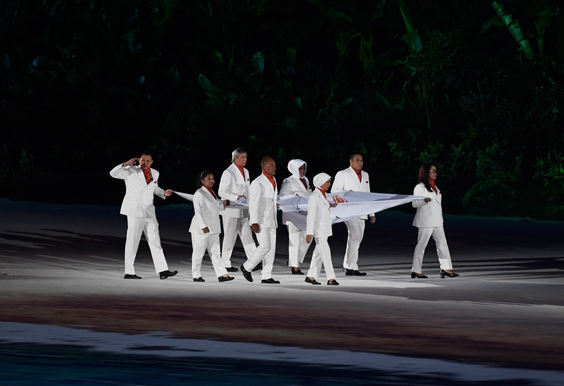 8月18日,亞奧理事會(huì)會(huì)旗在開幕式上入場(chǎng)。新華社記者王毓國(guó)攝