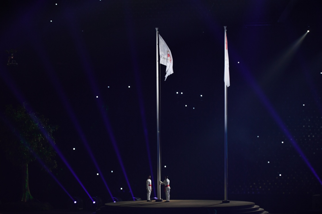 8月18日,亞奧理事會(huì)會(huì)旗(左)在開幕式上升起。新華社記者王毓國攝