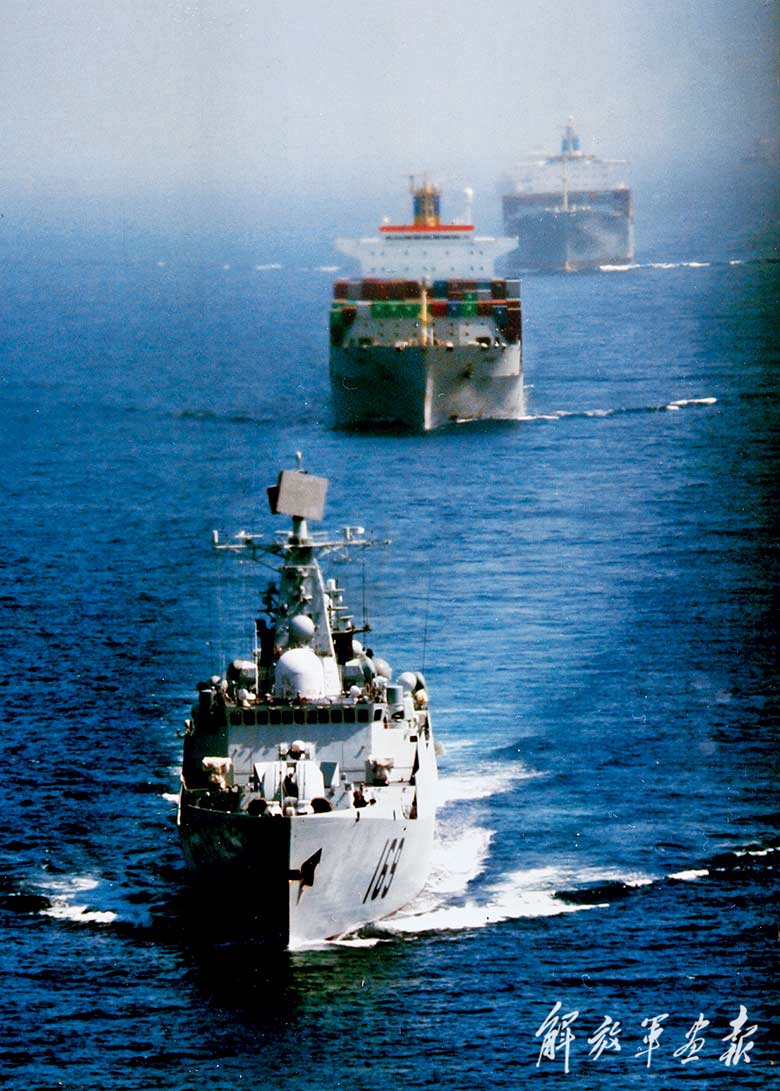 2009年1月6日,中國(guó)海軍首批護(hù)航編隊(duì)武漢艦在亞丁灣為中國(guó)商船護(hù)航。