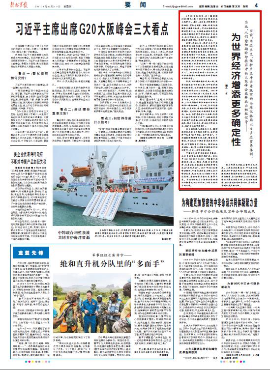 6月28日至29日,二十國集團(G20)領(lǐng)導(dǎo)人第十四次峰會將在日本大阪舉行。屆時,與會各方將圍繞全球經(jīng)濟、貿(mào)易與投資、創(chuàng)新、環(huán)境與能源等主題展開會談。請關(guān)注今日出版的《解放軍報》的詳細報道——