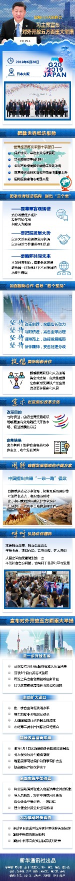6月28日,習近平主席在日本大阪舉行的二十國集團領導人峰會上發(fā)表題為《攜手共進,合力打造高質(zhì)量世界經(jīng)濟》的重要講話,宣布對外開放五方面重大舉措。