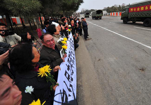 人民網(wǎng)沈陽3月28日電 北京時(shí)間3月18日12時(shí)50分左右,滿載著437具在韓中國志愿軍烈士遺骸的車隊(duì)抵達(dá)沈陽抗美援朝烈士陵園。在通往烈士陵園的陵園街路旁聚集著在這里等候多時(shí)的烈士后代家屬。他們手舉寫著“親人期盼你們?cè)缛栈丶摇薄爸袊嗣裰驹杠娏沂亢蟠佑H人回家”標(biāo)語的橫幅。隨后,滿載英烈遺骸的卡車一輛接一輛地駛過,卡車旁掛著“烈士業(yè)績永載史冊(cè)”的橫幅?,F(xiàn)場幾位年長的老人,看著滿載重歸故里英雄遺骸的車輛從眼前駛過,禁不住淚流滿面。