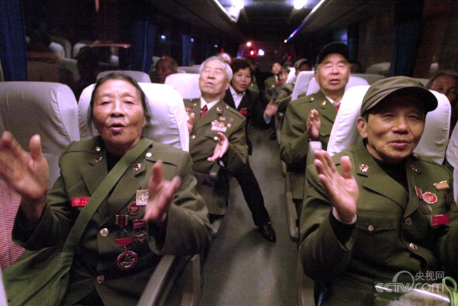 ??? 2010年10月22日傍晚,第三批赴朝參觀的河南鄭州抗美援朝老戰(zhàn)士之家的21名志愿軍老兵返回遼寧丹東,曾經(jīng)參加過上甘嶺戰(zhàn)斗的77歲的楊開德老人(左)和老戰(zhàn)士們抑制不住激動的心情,在大巴車內(nèi)唱起戰(zhàn)斗年代的老歌。