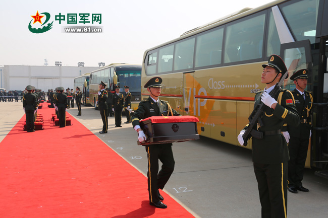沈陽軍區(qū)某部禮兵將棺槨搬運至大客車。