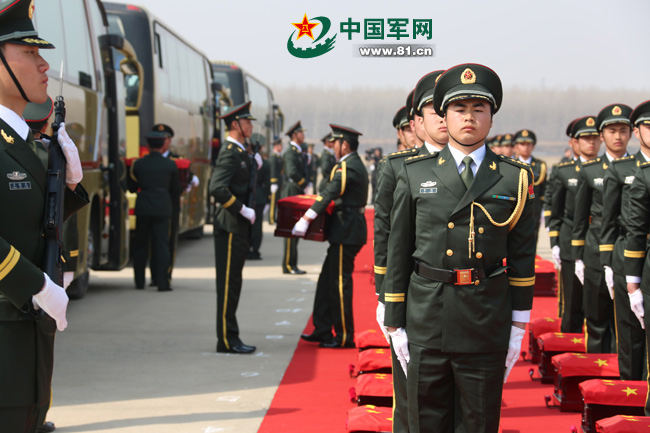 沈陽軍區(qū)某部禮兵將棺槨搬運(yùn)至大客車。