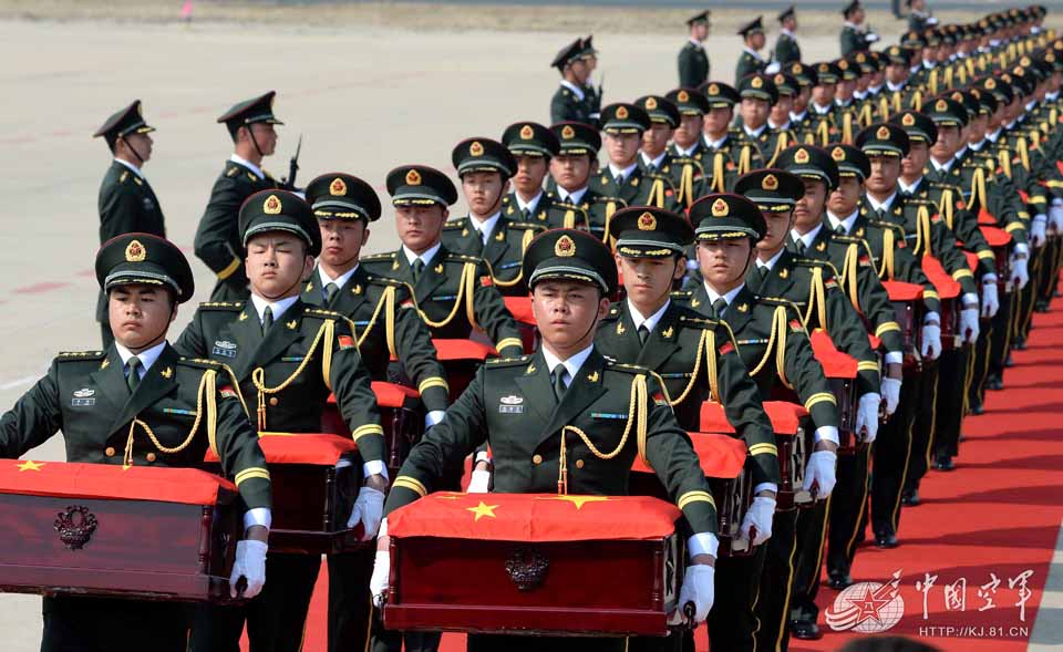 沈陽桃仙國際機場,禮兵們護送68具烈士遺骸棺槨踏上祖國大地