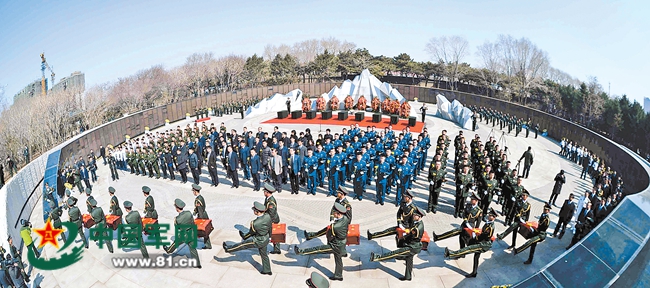 3月21日,禮兵護送志愿軍烈士遺骸棺槨緩緩步入沈陽抗美援朝烈士陵園下沉式安葬地宮。
