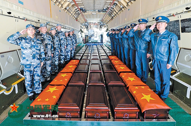 3月20日,烈士遺骸棺槨運上專機后,全體機組人員向烈士致敬。