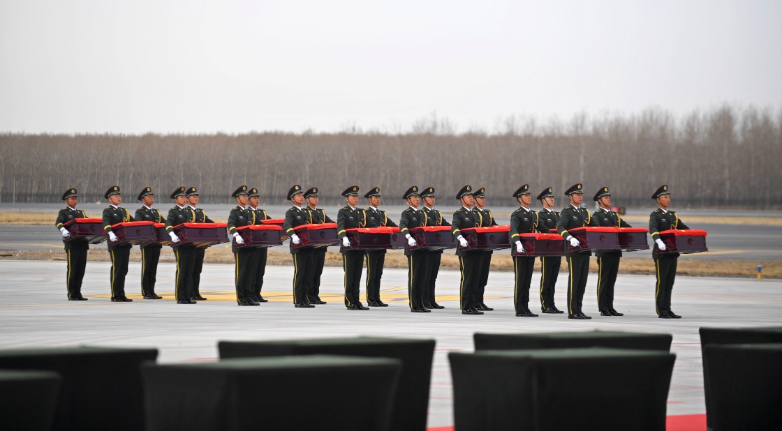 當日,第五批在韓中國人民志愿軍烈士遺骸由我空軍專機護送從韓國接回遼寧沈陽,20位志愿軍烈士英靈回到祖國和人民懷抱。新華社發(fā) 龍雷 攝