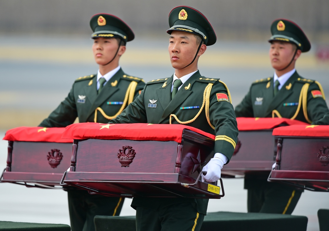 當(dāng)日,第五批在韓中國人民志愿軍烈士遺骸由我空軍專機(jī)護(hù)送從韓國接回遼寧沈陽,20位志愿軍烈士英靈回到祖國和人民懷抱。新華社記者 楊青 攝