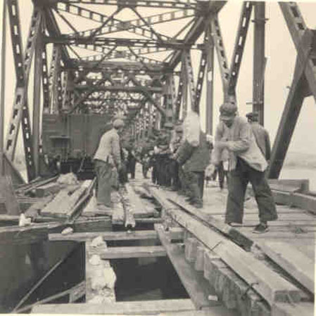 為積極支援朝鮮前線,志愿軍官兵夜以繼日搶修鴨綠江大鐵橋。(圖一)