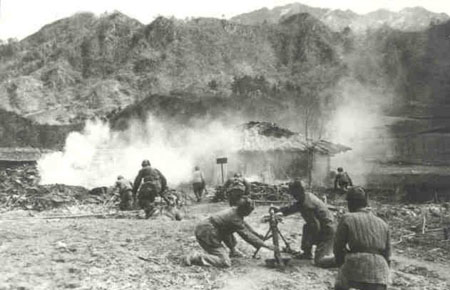 志愿軍在巨林川戰(zhàn)斗中,炮兵掩護(hù)步兵前進(jìn)。
