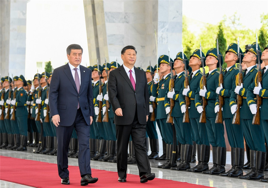 6月13日,國(guó)家主席習(xí)近平在比什凱克同吉爾吉斯斯坦總統(tǒng)熱恩別科夫會(huì)談。會(huì)談前,熱恩別科夫在阿拉爾恰國(guó)賓館會(huì)議中心前廣場(chǎng)為習(xí)近平舉行隆重歡迎儀式。這是兩國(guó)元首檢閱儀仗隊(duì)。新華社記者 謝環(huán)馳 攝
