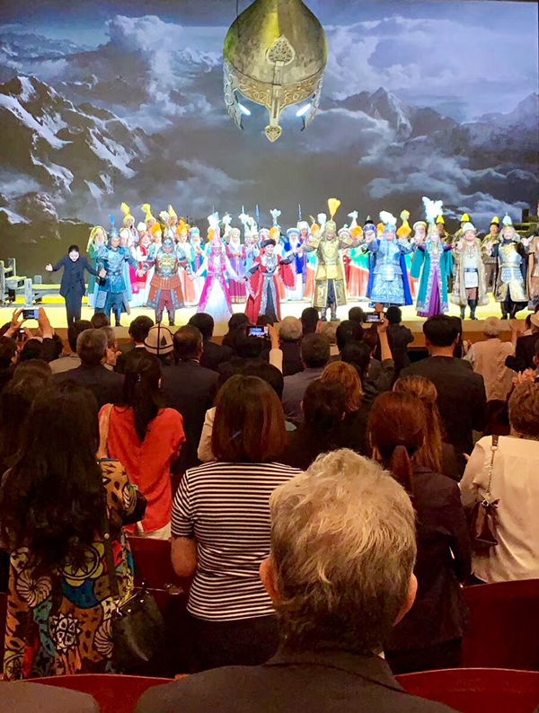 △應(yīng)熱恩別科夫總統(tǒng)邀請,中國中央歌劇院赴吉爾吉斯斯坦演出中文歌劇《瑪納斯》。6月11日晚,該劇在吉爾吉斯斯坦國家大劇院上演。(現(xiàn)場觀眾趙聰拍攝)