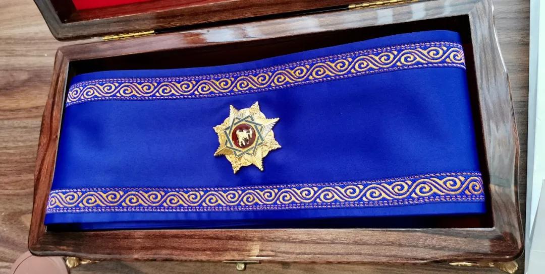 這就是授予習近平主席的勛章?!艾敿{斯”勛章是吉爾吉斯斯坦國家最高獎?wù)拢杉獱柤顾固箍偨y(tǒng)授予,分三個等級,一級為最高等級。新華社記者 丁林 攝