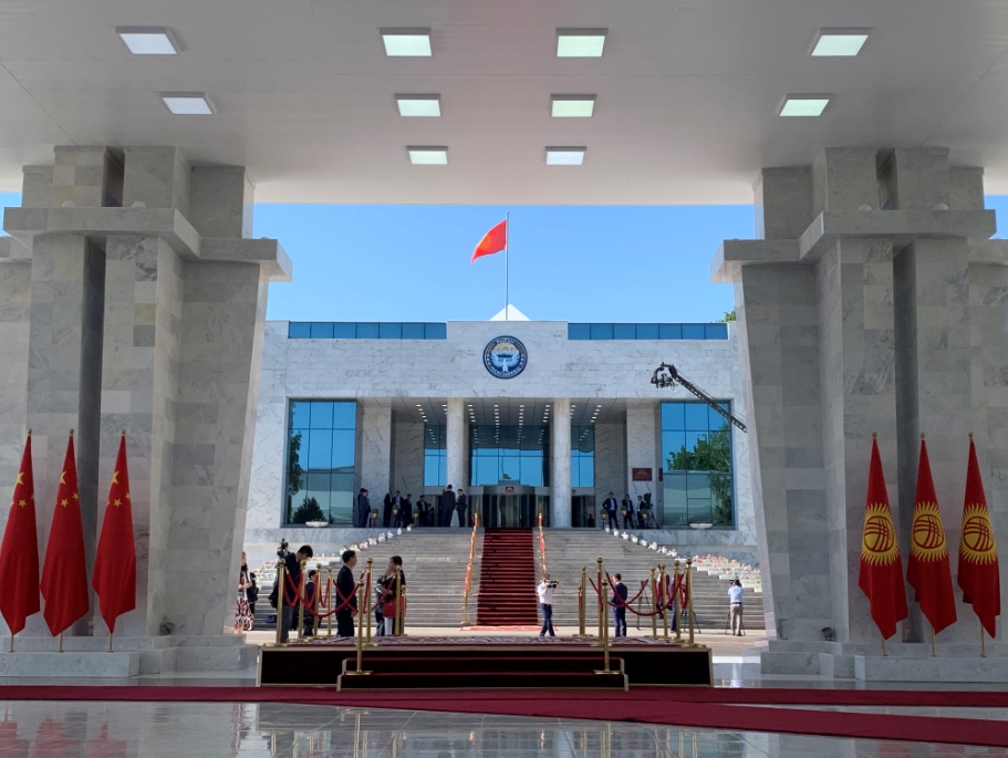 △阿拉爾恰國(guó)賓館會(huì)議中心前廣場(chǎng),歡迎儀式即將開(kāi)始。國(guó)賓館會(huì)議中心是中方為吉方舉辦2007年上合組織峰會(huì)援建的,是該國(guó)重要會(huì)議的舉辦場(chǎng)所。