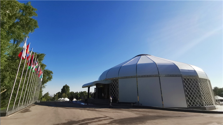 △傳統(tǒng)氈房造型的葉尼塞宮。13日中午熱恩別科夫總統(tǒng)歡迎習主席的宴會就是在這里舉行的。一天后,這里“換裝”成了上合峰會新聞中心。(央視記者張曉鵬拍攝)