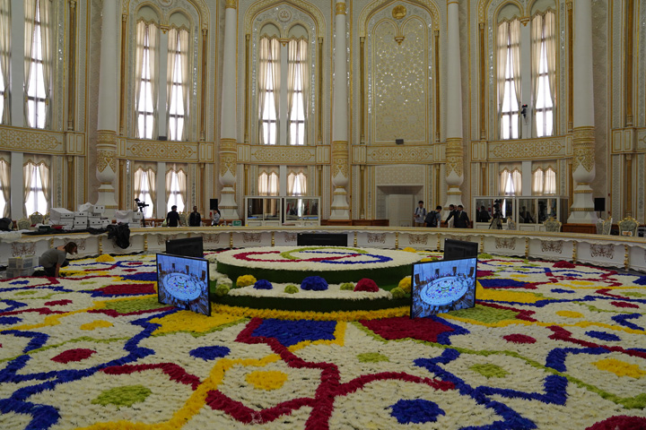 △舉辦峰會的金色大廳中央擺放著用鮮花拼成的亞信徽標。亞信徽標由藍色、綠色、紅色三環(huán)交織。峰會前一天,這個會場對媒體開放,這是工作人員正在對鮮花造型做最后的調整。
