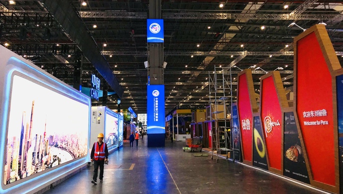 隨著布展工作進(jìn)入收尾階段,國(guó)家館的多數(shù)展臺(tái)主體結(jié)構(gòu)已搭建完畢,正在完成氛圍布置工作。