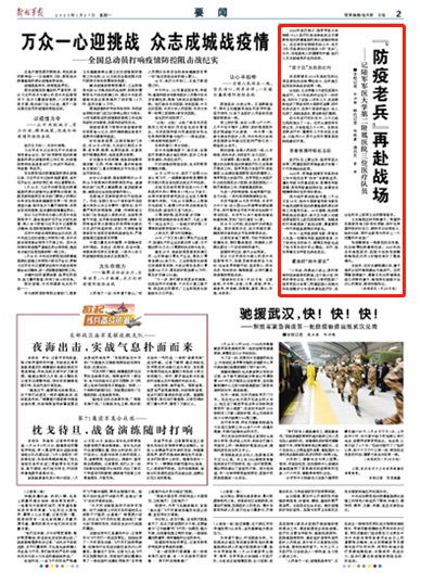 2020年農(nóng)歷除夕,陸軍軍醫(yī)大學(xué)抽組150人醫(yī)療隊連夜奔赴武漢支援新型冠狀病毒感染的肺炎疫情防控戰(zhàn)斗。在這場沒有硝煙的戰(zhàn)斗中,有不少隊員是參加過防疫戰(zhàn)斗的“老兵”。今天,當(dāng)祖國和人民需要的時候,他們義無反顧地再次走向戰(zhàn)場。