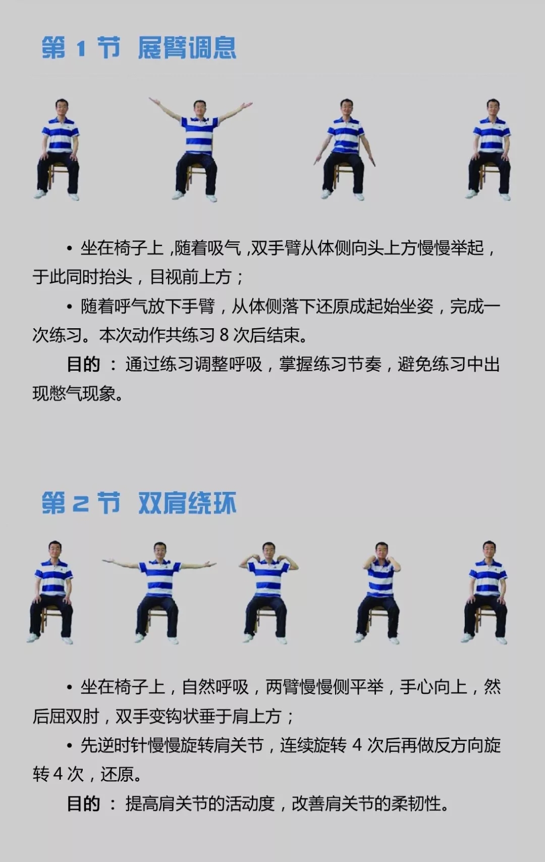練習(xí)時,起始動作要求端正地坐在椅子上,自然呼吸,目視前方,雙手臂下垂,雙腳平行,腳尖指向正前方,各節(jié)動作都以此為開始。