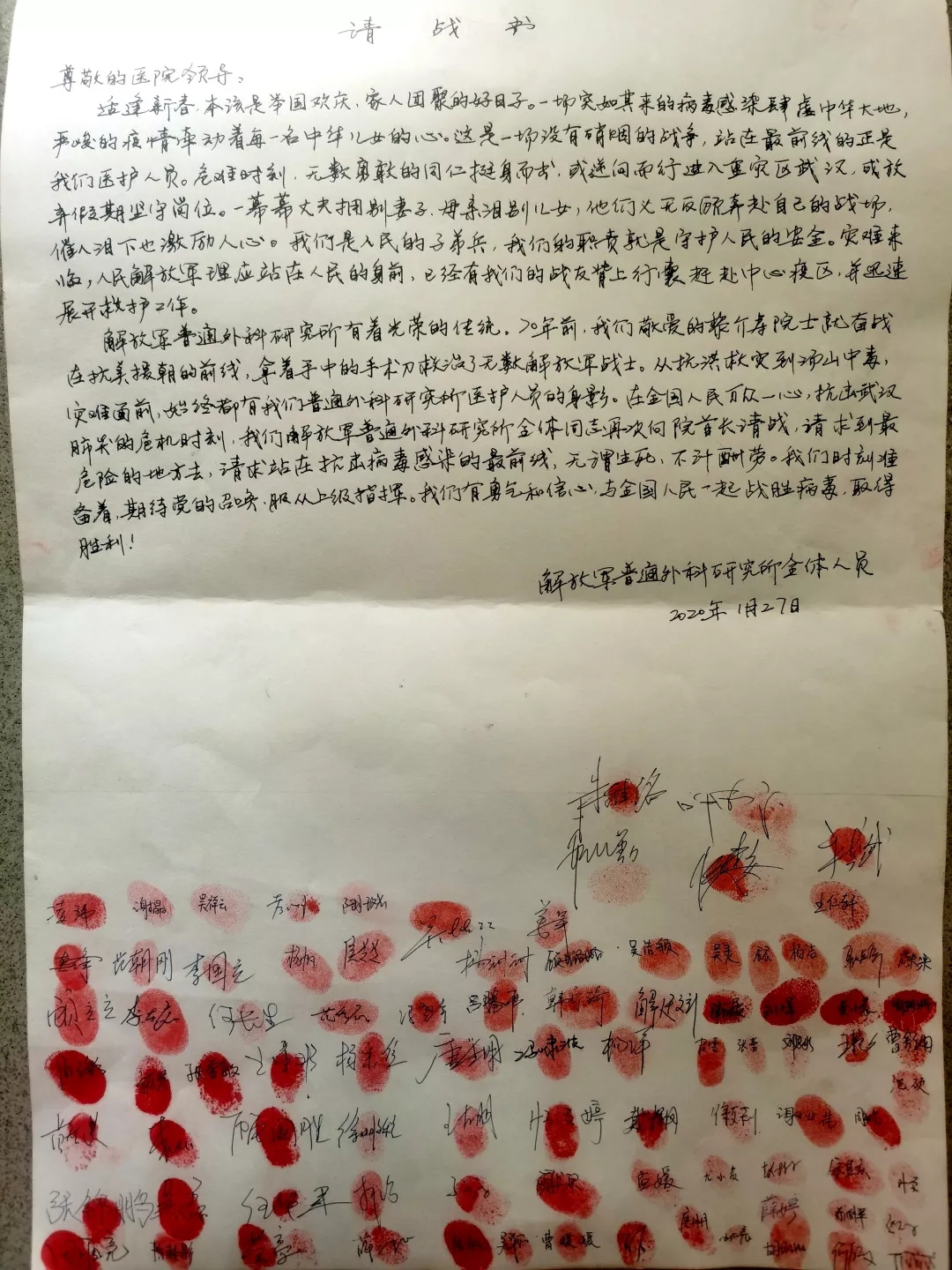 “請(qǐng)求到最危險(xiǎn)的地方去,請(qǐng)求站在抗擊病毒感染的最前線,無(wú)謂生死、不計(jì)酬勞。我們時(shí)刻準(zhǔn)備著,期待組織的召喚。我們有勇氣和信心與全國(guó)人民一起戰(zhàn)勝病毒,取得勝利?!逼胀ㄍ饪蒲芯克诵莘灯傅膮切越魅卧谌w人員“請(qǐng)戰(zhàn)書”上按下“紅手印”,“普通外科研究所有著光榮的傳統(tǒng)。70年前,我們敬愛(ài)的黎介壽院士就奮戰(zhàn)在抗美援朝的前線,拿著手中的手術(shù)刀救治了無(wú)數(shù)的解放軍戰(zhàn)士?!?/p>