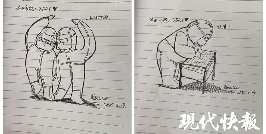 其實(shí),剛剛住進(jìn)方艙的時(shí)候,黎女士并沒(méi)有帶筆和本子,還是后來(lái)通過(guò)外賣(mài)購(gòu)買(mǎi)的。" 雖然他們每個(gè)人都穿著防護(hù)服,但是性格不一樣,做事方式也不一樣,我希望盡量能把他們的特點(diǎn)表現(xiàn)出來(lái)。醫(yī)護(hù)人員特別可愛(ài),今天還拿了一些白紙給我畫(huà)。"