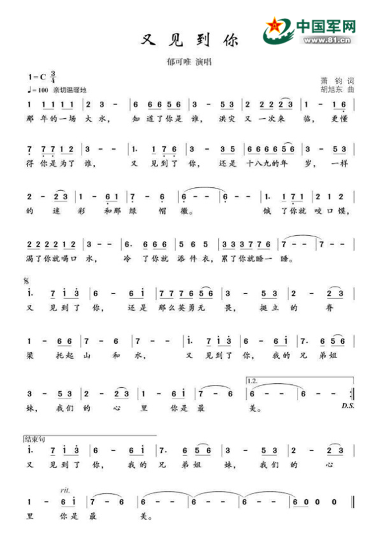 “那年的一場(chǎng)大水,知道了你是誰(shuí),洪災(zāi)又一次來(lái)臨,更懂得你是為了誰(shuí)……”軍令如山,誓言錚錚,一首《又見(jiàn)到你》,將滿(mǎn)腔赤誠(chéng)化為對(duì)人民子弟兵的深情禮贊。