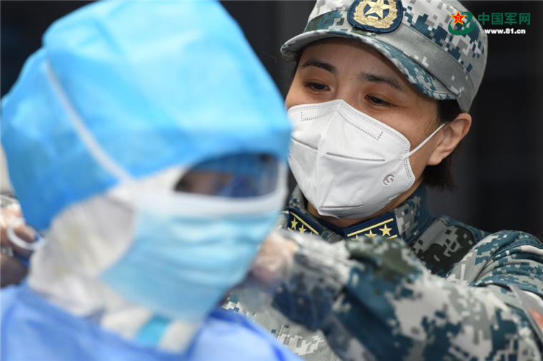 楊笑為戰(zhàn)友檢查防護(hù)服。