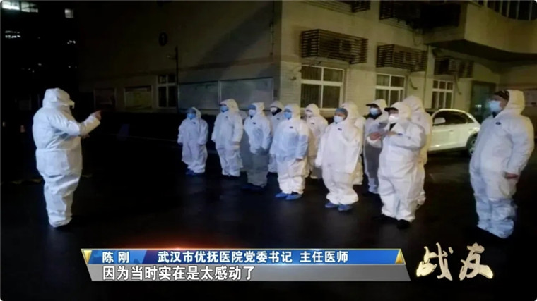 武漢市優(yōu)撫醫(yī)院黨委書記 主任醫(yī)師 陳剛:不到一個(gè)小時(shí),他們就零零星星地聚集到我們南門。我記得印象很深,當(dāng)時(shí)是我親自去迎接他們,因?yàn)楫?dāng)時(shí)實(shí)在是太感動(dòng)了,我是太需要這支隊(duì)伍了!