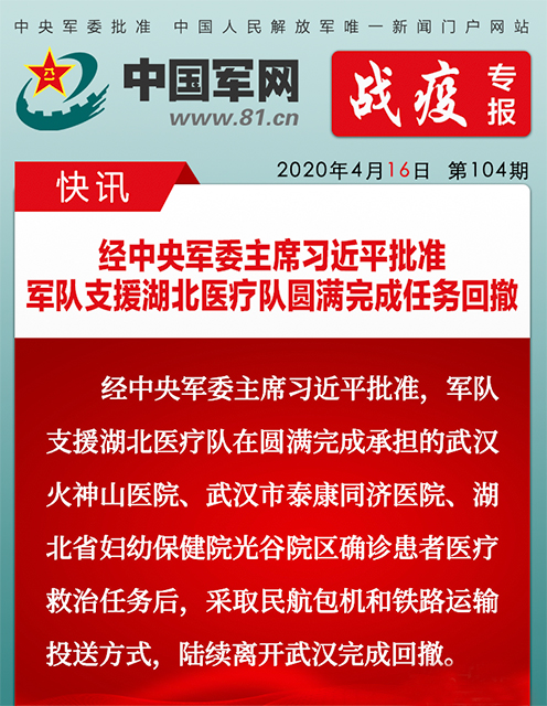 經(jīng)中央軍委主席習(xí)近平批準 軍隊支援湖北醫(yī)療隊圓滿完成任務(wù)回撤