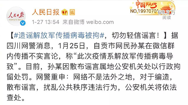 造謠解放軍傳播病毒被拘,切勿輕信謠言!2020-01-27 18:29