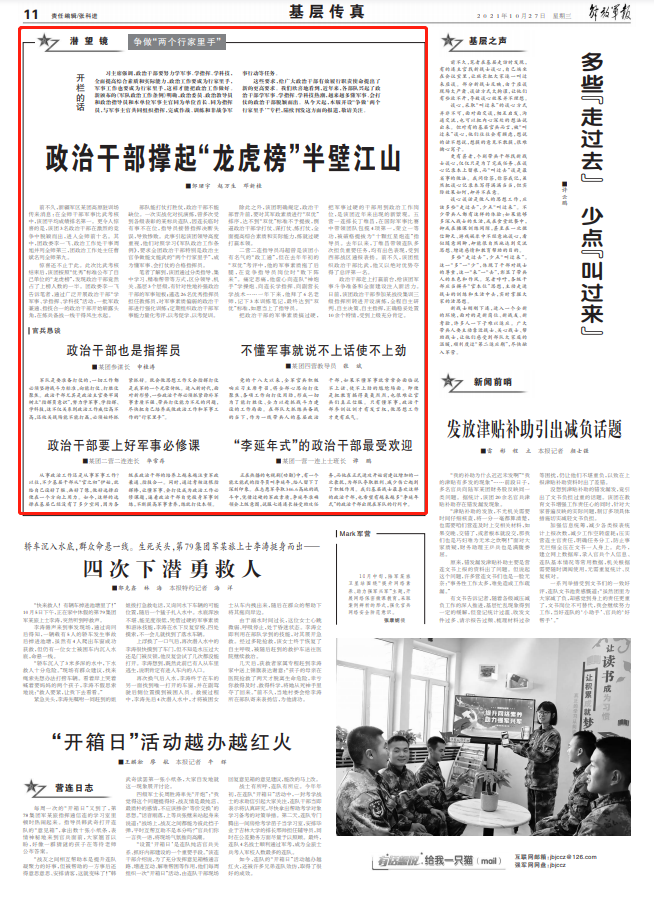 驚喜還不止于此。此次比武考核結(jié)束后,該團(tuán)按照“優(yōu)秀”標(biāo)準(zhǔn)公布了自己單位的“龍虎榜”,發(fā)現(xiàn)政治干部竟然占了上榜人數(shù)的一半。團(tuán)政委李一飛告訴筆者,通過廣泛開展政治干部“學(xué)軍事、學(xué)指揮、學(xué)科技”活動(dòng),一批軍政兼通、指技合一的政治干部開始嶄露頭角,在練兵備戰(zhàn)一線干得風(fēng)生水起。