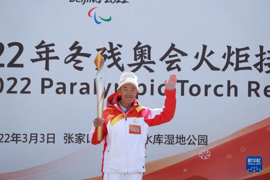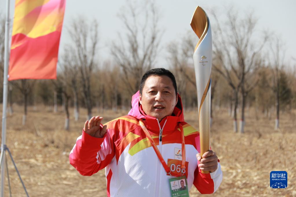 3月3日,北京冬殘奧會火炬手郭萬剛在懷來官廳水庫國家濕地公園傳遞火炬。新華社記者趙鴻宇攝