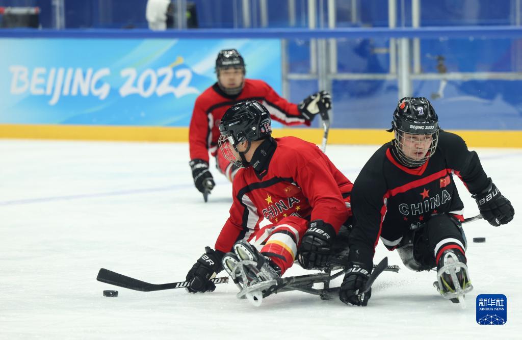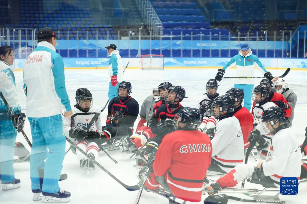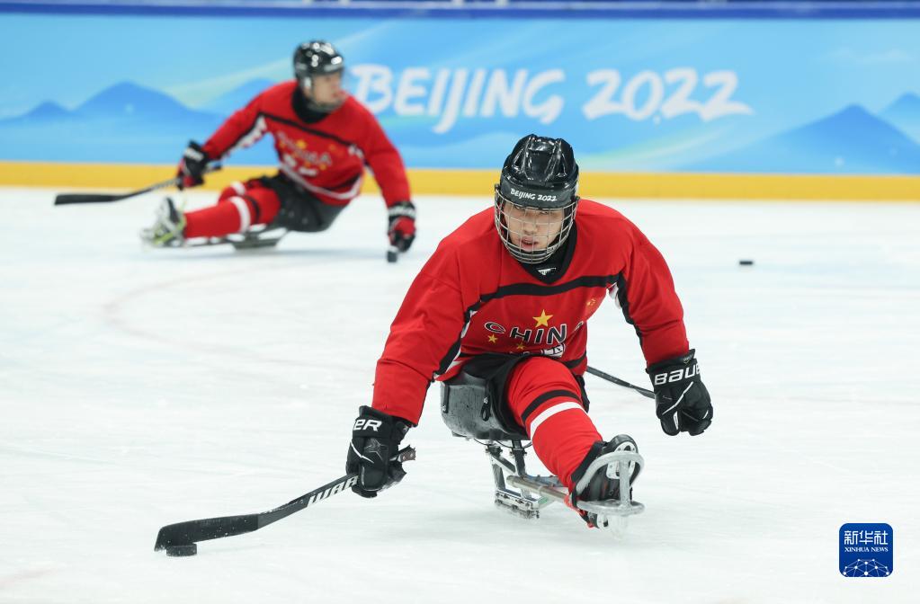 3月1日,中國(guó)殘奧冰球隊(duì)在訓(xùn)練中。當(dāng)日,中國(guó)殘奧冰球隊(duì)在國(guó)家體育館訓(xùn)練,備戰(zhàn)北京冬殘奧會(huì)。新華社記者 張可任 攝