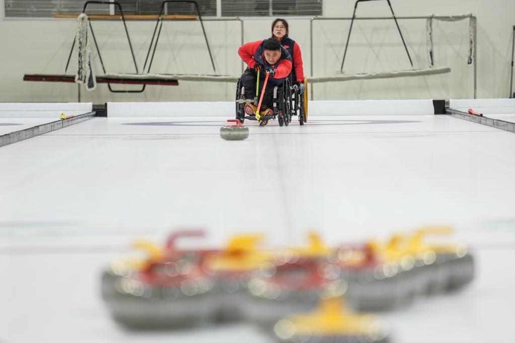 輪椅冰壺運動員王海濤(前)在國家殘疾人冰上運動比賽訓(xùn)練館投壺。新華社記者彭子洋攝