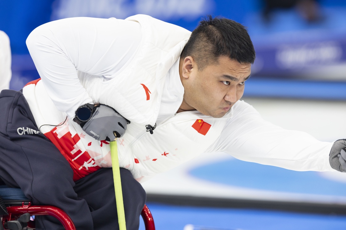 3月10日,中國隊選手張明亮(右)在比賽中擲壺。新華社記者 許雅楠 攝
