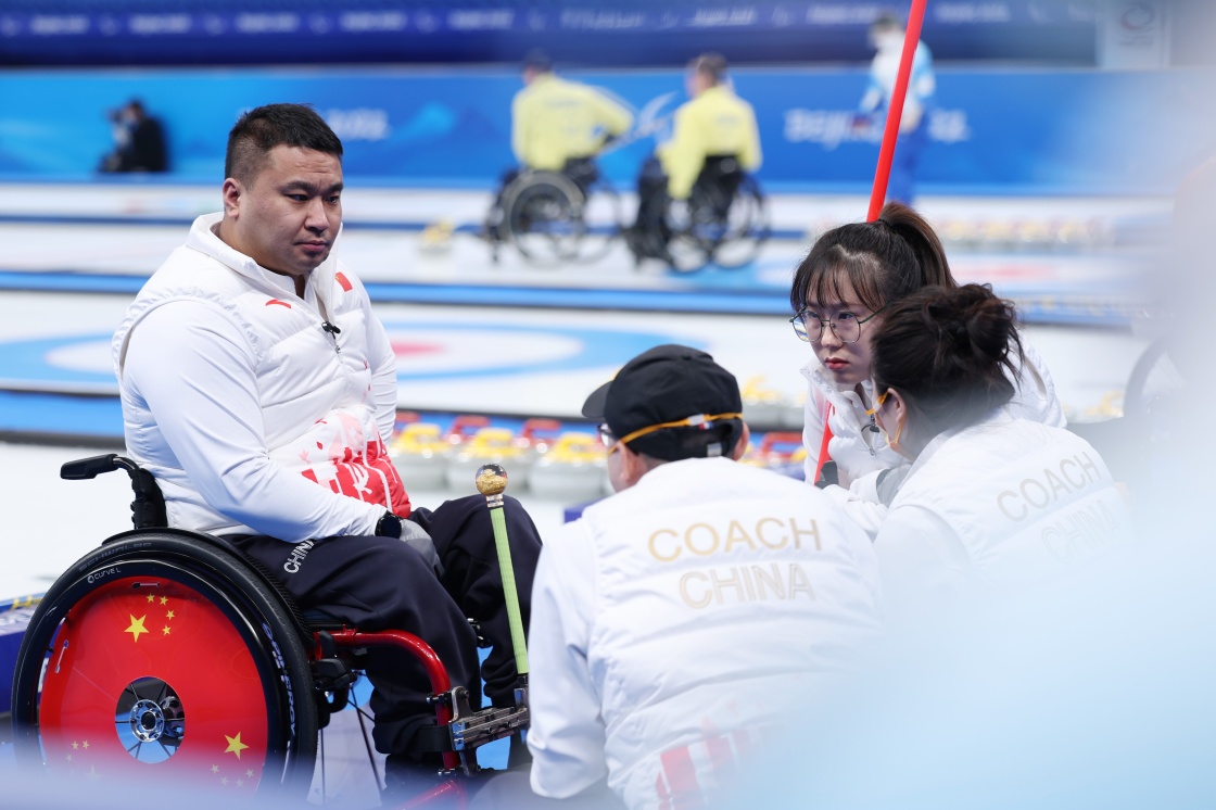 3月10日,中國隊選手王海濤(左一)、閆卓(右二)在比賽間隙聆聽教練指導。新華社記者 許雅楠 攝