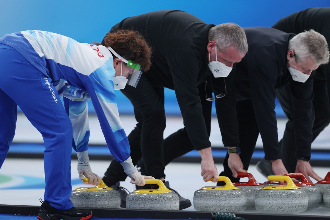 3月6日,志愿者(左一)在比賽中協(xié)助移動(dòng)冰壺。新華社記者 許雅楠 攝
