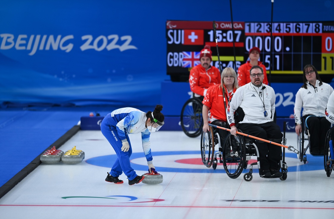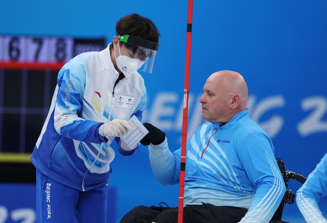 3月6日,志愿者在輪椅冰壺循環(huán)賽中與運(yùn)動(dòng)員溝通。新華社記者 許雅楠 攝