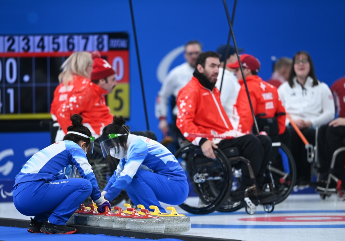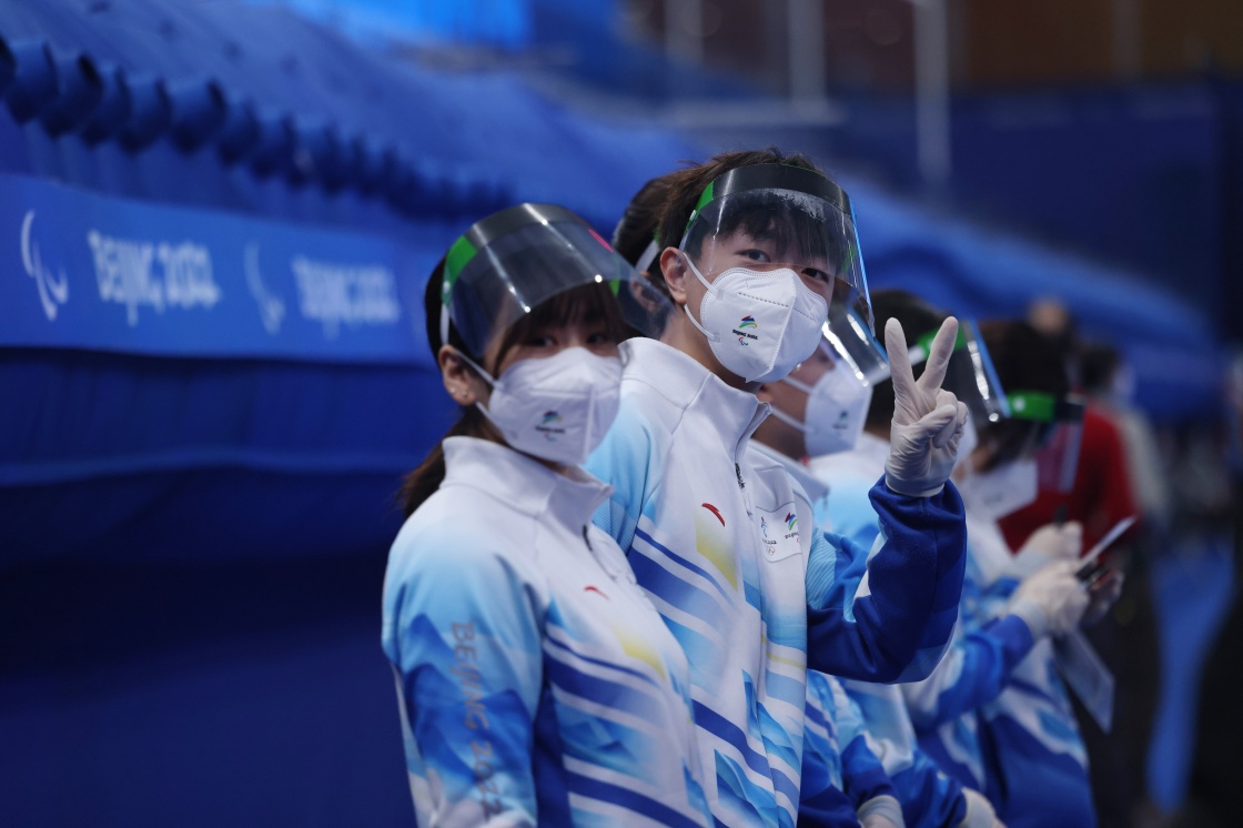 3月6日,志愿者在輪椅冰壺循環(huán)賽前候場(chǎng)。新華社記者 許雅楠 攝