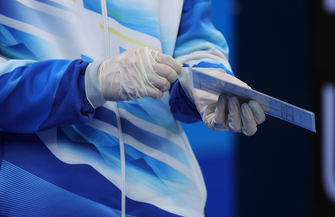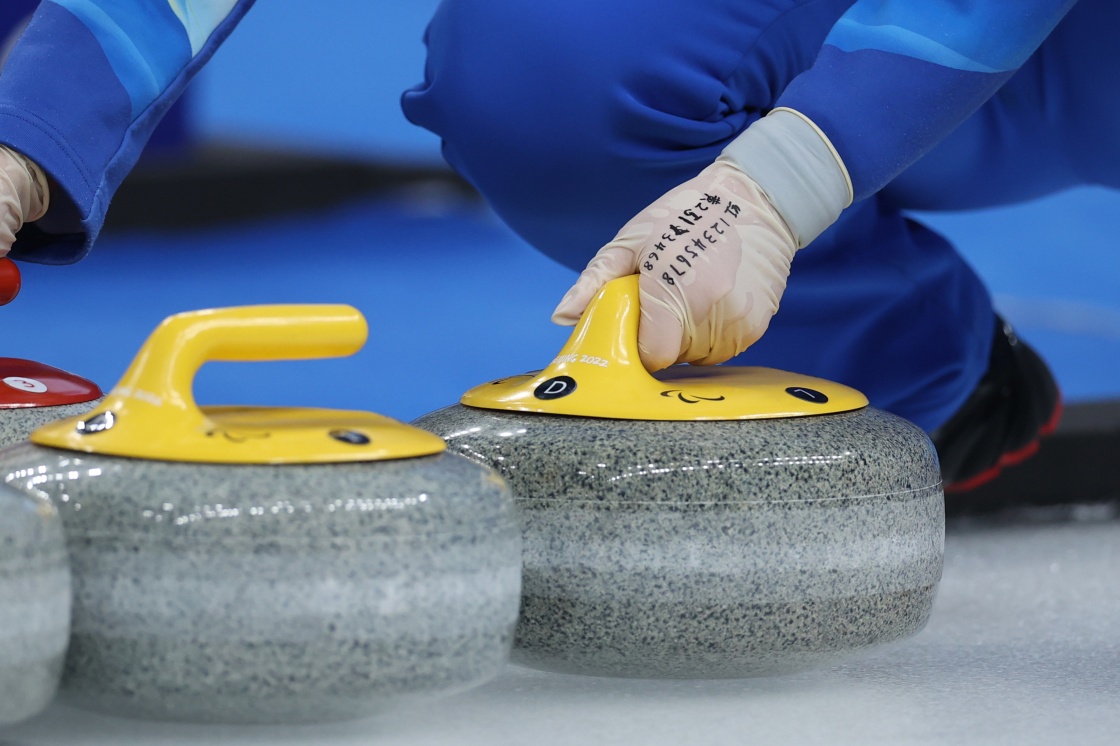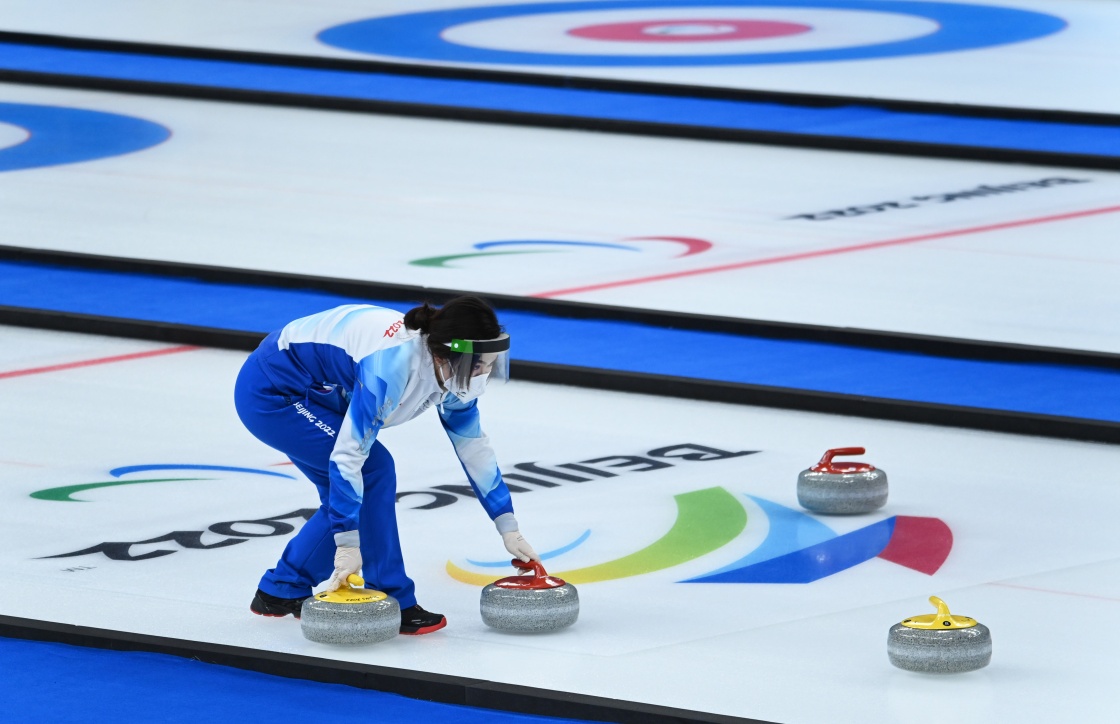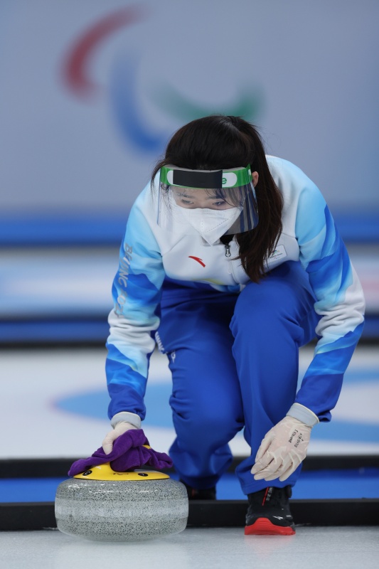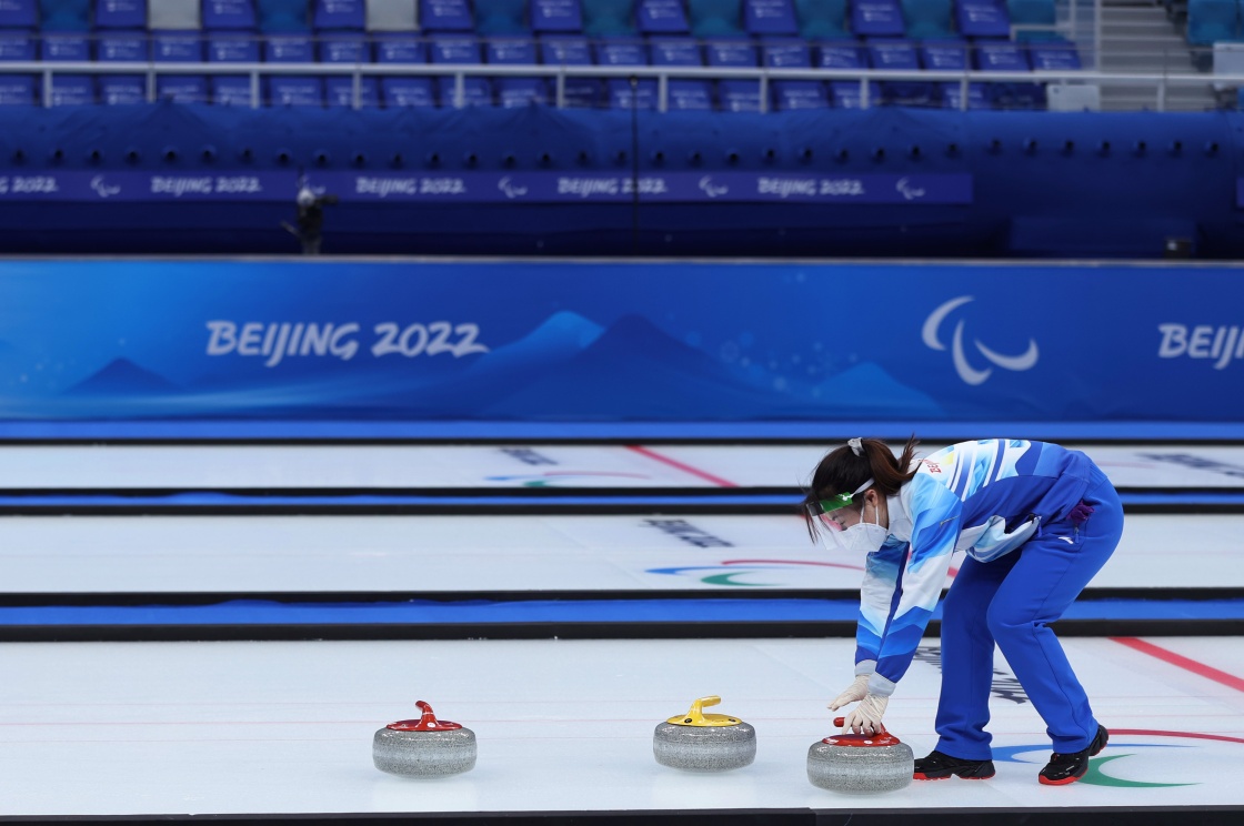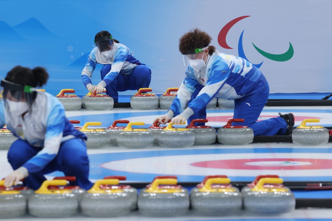 3月6日,志愿者在輪椅冰壺循環(huán)賽中為運(yùn)動(dòng)員整理冰壺,手套上記錄著冰壺?cái)[放順序。新華社記者 許雅楠 攝