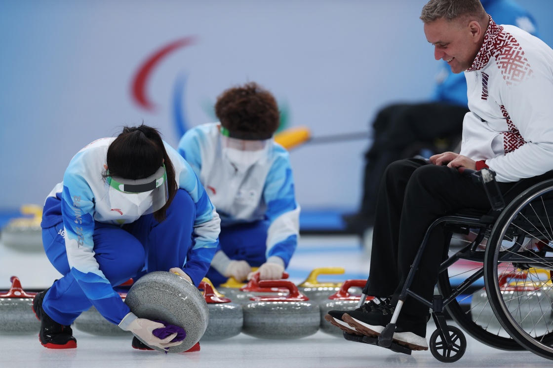 3月6日,志愿者在輪椅冰壺循環(huán)賽中為運(yùn)動(dòng)員擺冰壺。新華社記者 杜瀟逸 攝