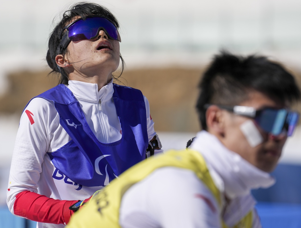 王躍在殘奧越野滑雪女子長(zhǎng)距離傳統(tǒng)技術(shù)(視障)比賽后(3月7日攝)。新華社記者 胡虎虎 攝