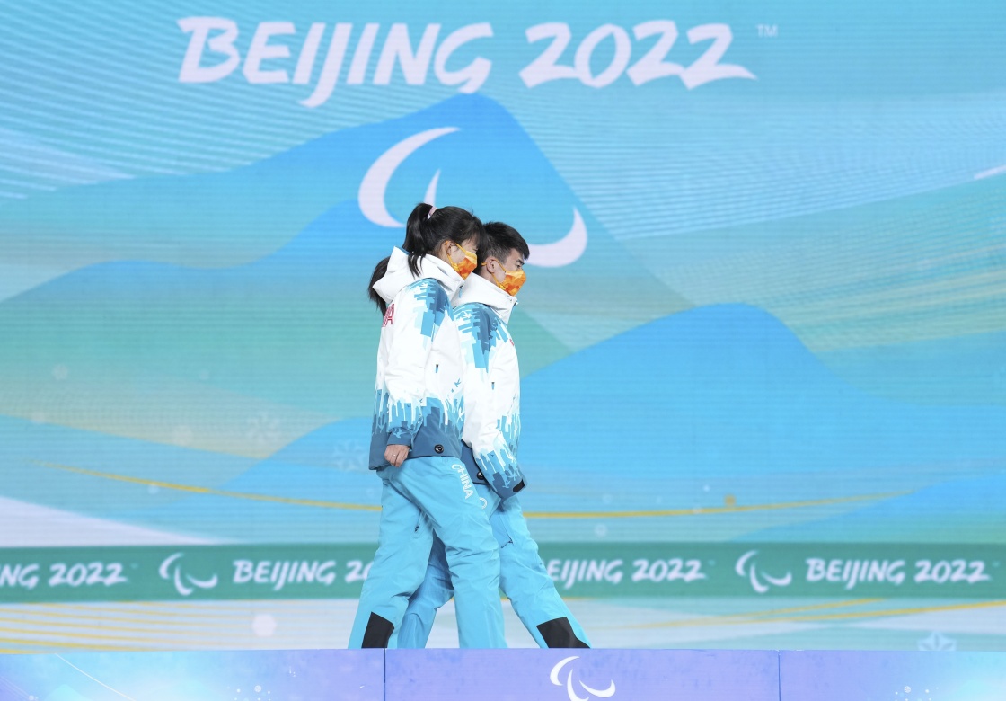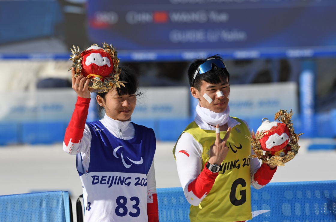 3月8日,王躍(左)和引導(dǎo)員李亞林參加殘奧冬季兩項(xiàng)女子中距離(視障)比賽頒獎(jiǎng)儀式。新華社記者 胡虎虎 攝