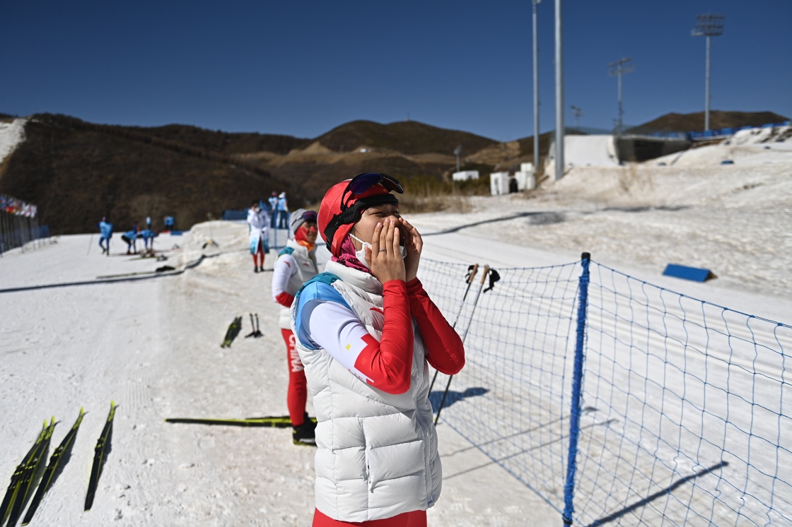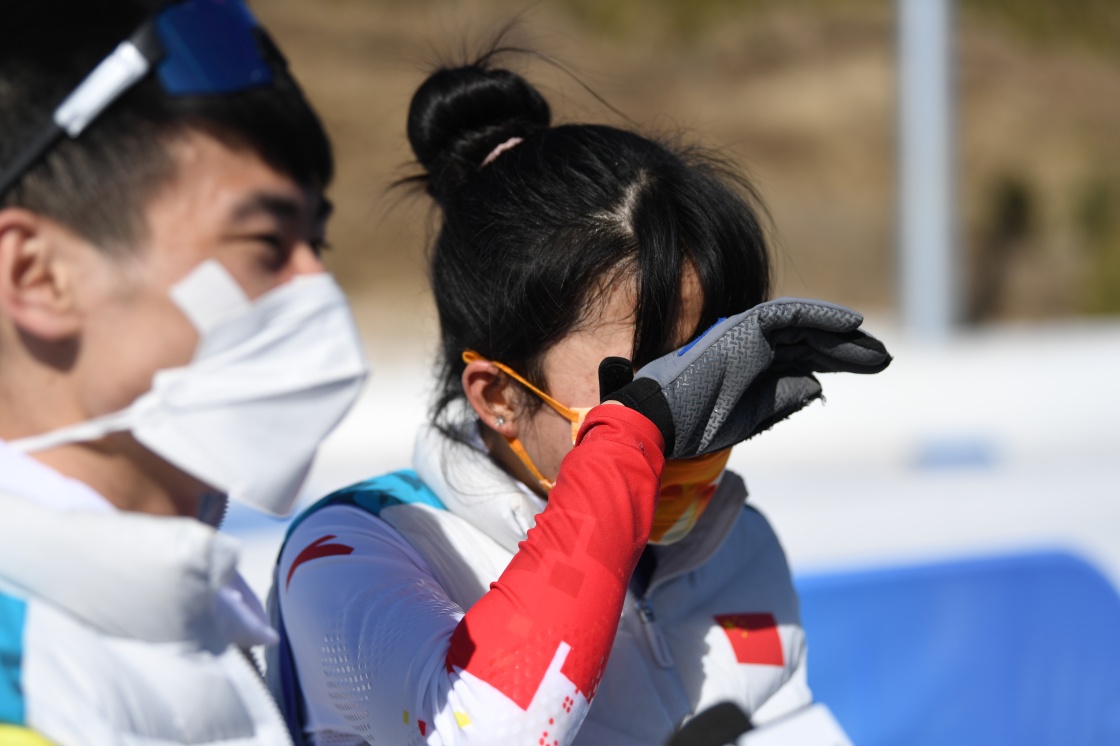 3月8日,王躍在殘奧冬季兩項(xiàng)女子中距離(視障)比賽后流淚。新華社記者 趙子碩 攝