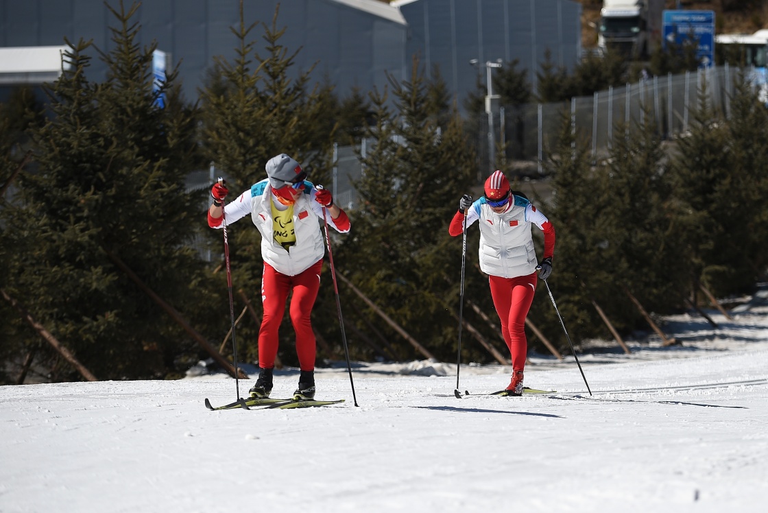 王躍(右)與引導(dǎo)員李亞林在殘奧越野滑雪女子長(zhǎng)距離傳統(tǒng)技術(shù)(視障)比賽前熱身(3月7日攝)。新華社記者 侯昭康 攝